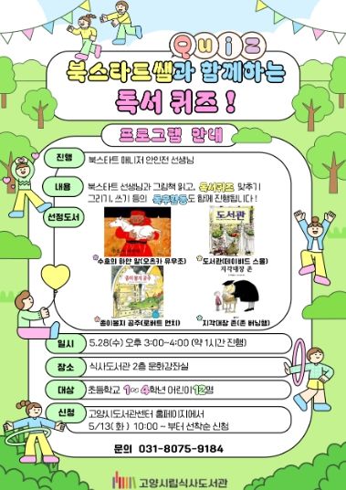 (정도일보) 고양특례시 식사도서관이 어린이 공공도서관 북스타트 연계 프로그램‘북스타트 선생님과 함께 푸는 독서퀴즈’를 오는 28일 운영한다고 밝혔다.
