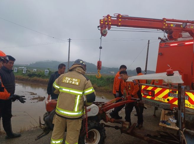(정도일보) 여수소방서는 5월 16일 오전 7시 25분경 경운기가 농수로에 빠졌는데 사람이 나오지 못하고 있다는 신고 접수를 받고 119구조대가 신속히 출동했다.