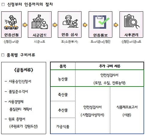 '농수특산물 품질관리법', '식품위생법' 등 관련 법령에 따라 안전성 검사를 실시하며, 신청 품목별 담당부서의 품질관리 심사 등 관련 조례에 따른 인증 절차를 거쳐 인증 마크를 부여하고 있다.