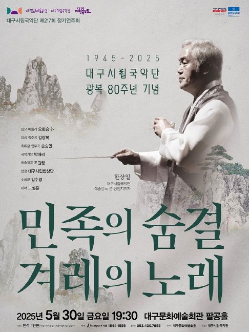(정도일보) 대구시립국악단(예술감독 겸 상임지휘자 한상일) 제217회 정기연주회이자 광복 80주년 기념공연 ‘민족의 숨결 겨레의 노래’가 5월 30일 오후 7시 30분 대구문화예술회관 팔공홀에서 펼쳐진다.