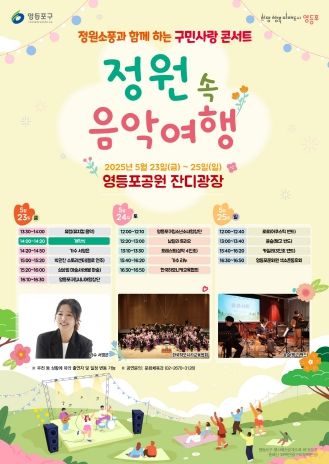 자세한 일정은 구 누리집 ‘우리구소식’ 게시판을 통해 확인할 수 있다. 영등포 정원축제 관련 문의는 구 정원도시과로, 구민사랑 콘서트는 문화체육과로 하면 된다.