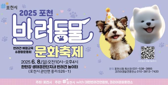 (정도일보) 포천시는 오는 6월 8일 한탄강 생태경관단지 내 반려견 놀이터에서 ‘2025 포천 반려동물 문화축제’를 개최한다.