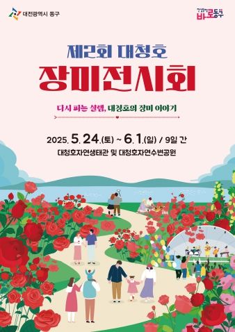 박희조 동구청장은 “올해 장미전시회는 장미 품종과 정원 구성은 물론, 공연과 체험 콘텐츠까지 대폭 강화해 남녀노소 누구나 즐길 수 있는 행사로 준비했다”며 “대청호라는 천혜의 자연환경 속에서 장미가 전하는 감동과 여유를 느끼며, 가족·연인·친구와 함께 행복한 추억을 만들어 가시길 바란다”고 말했다.