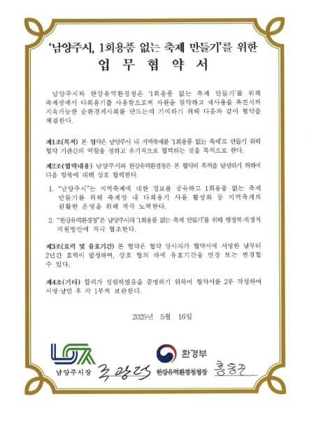 주광덕 남양주시장은 “이번 협약은 남양주시가 친환경 도시로 나아가고 탄소중립 정책을 실현하는 데 부합하는 의미 있는 이정표”라며 “시민과 함께 만드는 1회용품 없는 축제를 통해 공감대를 형성하고, 이를 꾸준히 실천해 나갈 수 있도록 노력하겠다”라고 말했다.