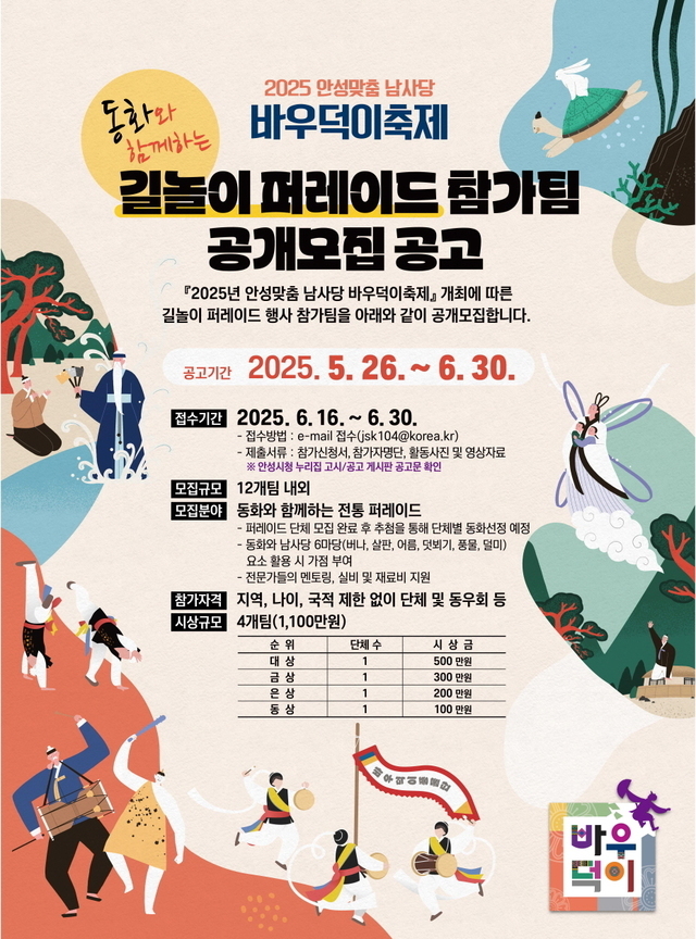 [정도일보 김선자 기자] 안성시가 오는 10월 개최 예정인 '2025 안성맞춤 남사당 바우덕이축제'의 대표 프로그램인 '길놀이 퍼레이드' 참가팀 접수를 16일부터 30일까지 진행한다.