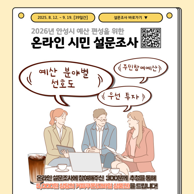 [정도일보 김선자 기자] 안성시가 예산 편성 과정에 시민 의견을 적극 반영하기 위해 오는 9월 19일까지 ‘2026년도 예산편성을 위한 설문조사’를 실시한다.