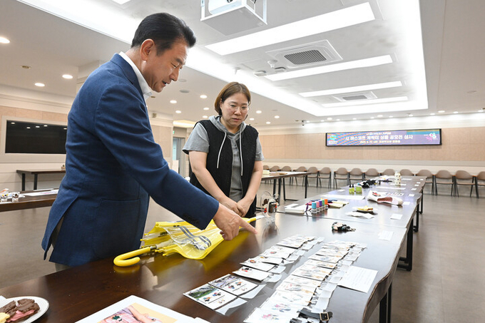 김동근 시장이 8월 22일 ‘의정부시 마스코트 캐릭터 상품 공모전’에 출품된 작품들을 둘러보고 있다 [사진-의정부시]