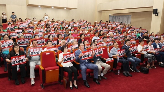 용인SK하이닉스반도체산업단지 고압송전선로 및 LNG 열병합 발전소 건립 추진 반대를 위한 ‘안성시 범시민 비상대책위원회’ 발대식 참석자들이 반대 퍼포먼스를 하고 있다 [사진=안성시]
