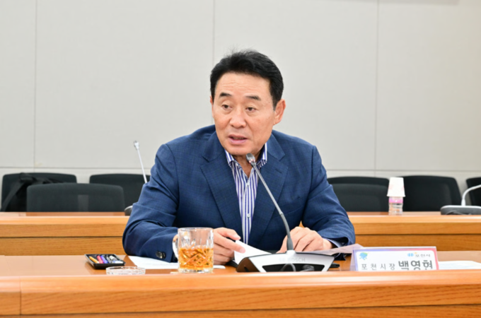 백영현 포천시장이 10일 시청 시정회의실에서 열린 '소흘·양문 연료전지 발전사업 양해각서(MOU)' 협약식에 참석해 인사말을 하고 있다. [사진=포천시]