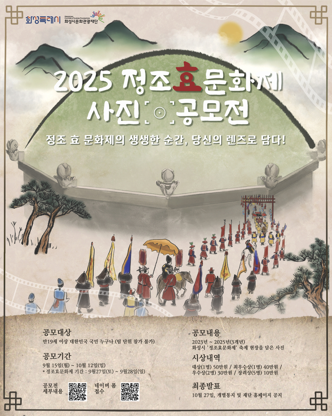 [정도일보 김현섭 기자] 화성시문화관광재단은 화성시 대표 축제인 ‘정조 효 문화제’에 대한 관심도 확산과 축제 현장의 감동과 재미를 생생히 알리고자 「2025 정조효문화제 사진공모전」을 개최한다.