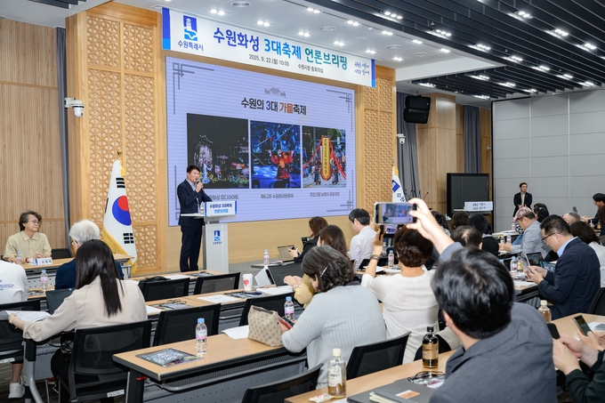 곽도용 수원시 문화청년체육국장은 22일 시청 중회의실에서 ‘세계유산 수원화성 3대 가을축제 언론브리핑’을 열고, “3대 가을축제가 글로벌축제로 자리매김하도록 최선을 다해 준비하겠다”고 말했다.