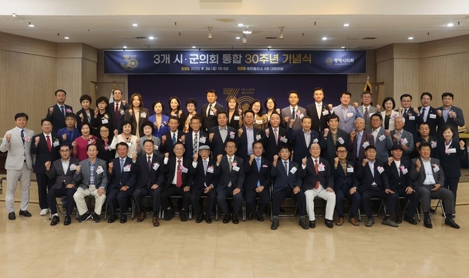 3개 시·군 의회 통합 30주년 기념행사 단체 기념촬영을 하고 있다.