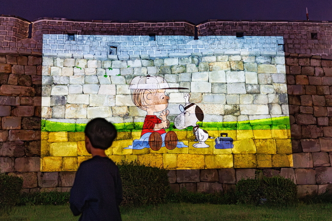 올해 미디어아트에서 피너츠사와 협업으로 수원화성 성벽에 스누피 캐릭터가 비춰지고 있다.