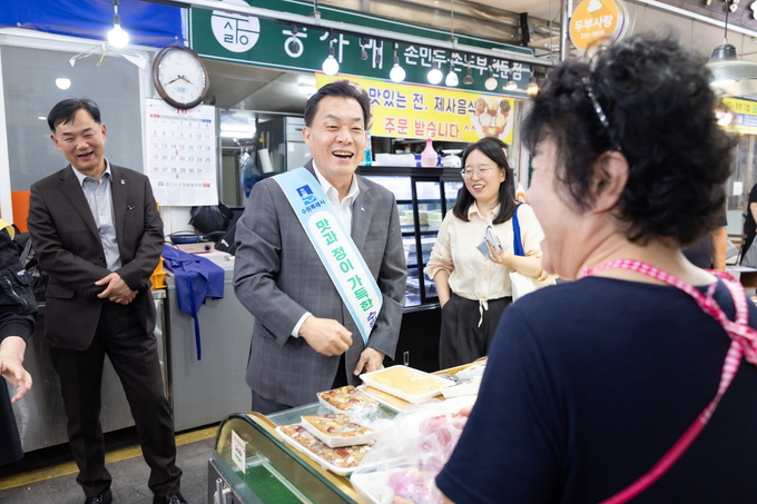 [정도일보 고정희 기자] 이재준 수원시장이 추석 명절을 앞두고 29일 권선종합시장에서 장을 보고, 상인들을 응원했다. 구매한 식료품은 사회복지시설에 전달했다.