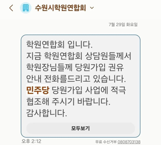 한편, 수원시학원연합회는 지난 7월 회원 학원장들에게 "학원의 권익 보호를 위해 내년 지방선거에서 학원장을 시·도의원 후보로 출마시키겠다"며 "집권당인 민주당 지지를 선언하고 민주당 후보로 도전한다. 시도의원 출마를 위해 당원가입서를 제출해야 하는데, 학원별 1명 이상 당원 가입에 협조해 달라. 안내원이 전화로 가입을 받는다"는 내용과 함께 주민등록번호 입력 방법, 당비 납부 방식까지 구체적으로 안내했다.