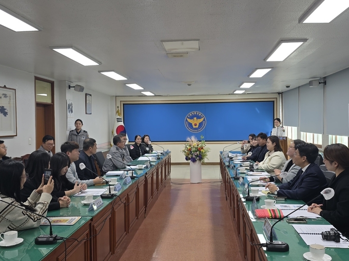 수원시자원봉사센터와 영통학부모협회는 28일 수원 영통경찰서 2층 회의실에서 나원오 경찰서장, 교통과 관계자들이 참석한 가운데 ‘안전한 통학로 확보’와 관련한 간담회를 열고 있다.