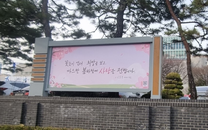 [정도일보 고정희 기자] 수원시가 2023년 수원희망글판 봄편 문안 ‘꽃눈이 열려 희망을 보고, 따스한 봄바람에 사랑을 전합니다’를 5월까지 수원시 곳곳과 수원시 유튜브 채널에 게시한다.