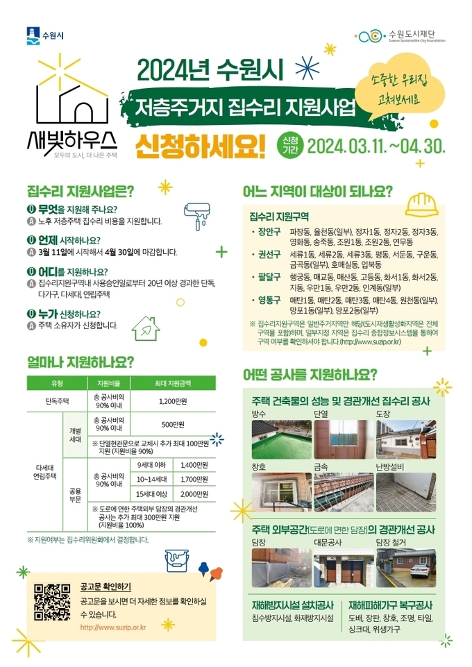 수원시 관계자는 “새빛하우스 신청 의사를 밝힌 시민들에게 문자메시지로 절차를 안내하고, 집수리지원구역 내에 현수막을 게시하는 등 적극적으로 사업을 홍보할 것”이라며 “노후화된 저층 주거지에 거주하는 주민들이 많이 신청해 주시길 바란다”고 말했다.