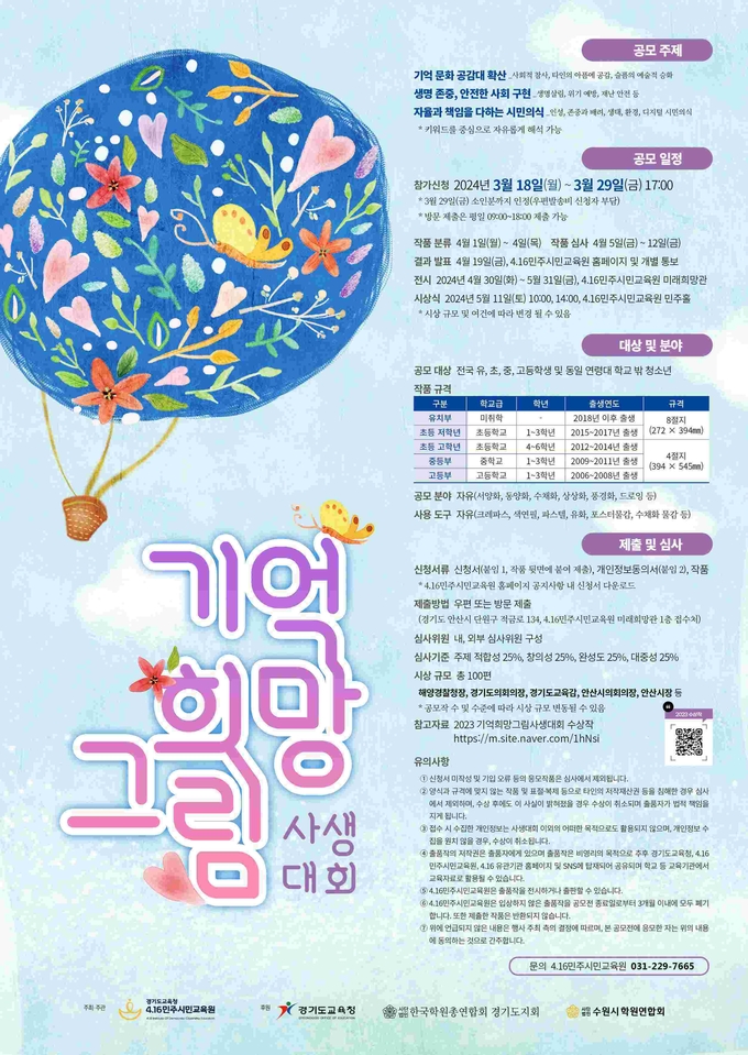 4.16민주시민교육원(원장 전명선)은 오는 18일부터 29일까지 유·초·중·고등학생과 동일 연령대 학교 밖 청소년을 대상으로 ‘2024 기억 희망 그림 사생대회’를 개최한다고 밝혔다.