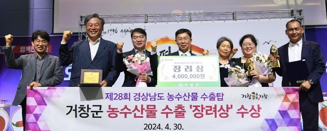 (정도일보) 거창군은 지난 30일 창원컨벤션센터에서 이병철 부군수를 비롯한 수출관계자 200여 명이 참석한 가운데 열린 제28회 경상남도 농수산물 수출탑 시상식에서 농수산물 수출시책 평가 부문 기관 장려상을 수상했다고 밝혔다.