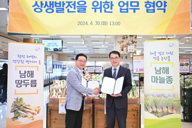 (정도일보) 남해군과 이마트는 4월 30일 대구 이마트 월배점에서 농산물 판매 및 홍보를 위한 업무협약(MOU)을 체결했다. 이는 지난해 4월 체결한 첫 업무협약에 이은 두 번째 상생 다짐의 장으로, 보물초와 마늘종 등 품질 좋은 남해군 농산물의 판로 확대에 크게 기여할 것으로 기대된다.