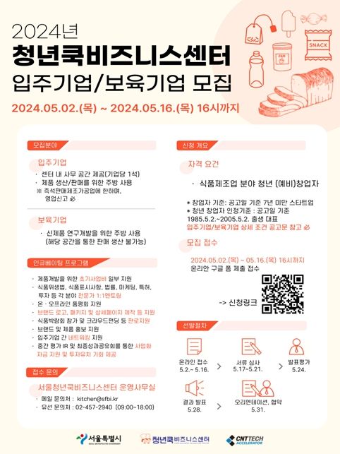 서울시는 2024년 청년 쿡 비즈니스센터와 함께 성장하고 싶은 식품제조업 분야 청년 스타트업을 5월 2일부터 5월 16일 16시까지 2주간 모집한다고 밝혔다. 올해는 입주기업 5개 팀과 보육기업 12개 팀 등 총 17개 팀을 선발한다.
