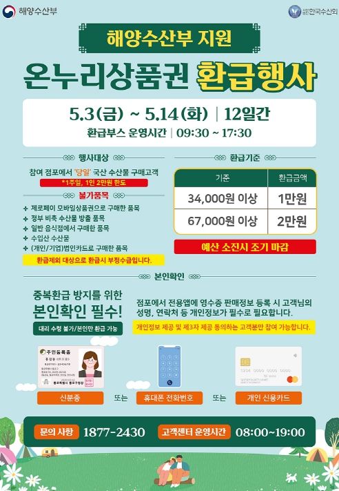 오는 5월 3일부터 14일까지 대구농수산물도매시장 수산시장에서 국내산 수산물, 젓갈류 등 가공식품(국내산 원물 70% 이상)을 구입하면 야외 환급 장소에서 당일 구매금액의 최대 30%를 온누리상품권으로 환급받을 수 있다.