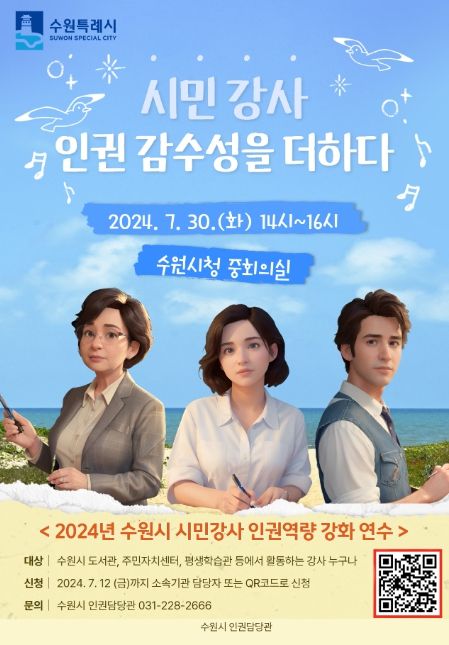 시민강사 인권역량 강화 연수는 7월 30일 오후 2시 수원시청 중회의실에서 열린다. ‘시민 강사, 인권 감수성을 더하다’를 주제로 하는 이날 연수는 김성학 에듀웨이 대표의 강의로 이뤄진다.