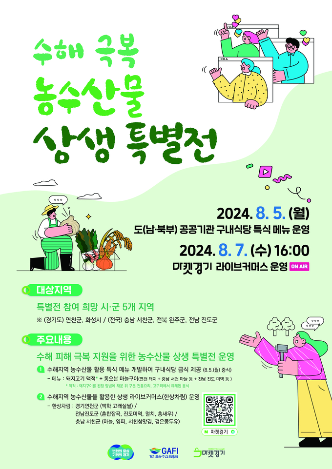 또한, 도 및 산하기관 등 15개 공공기관 구내식당에서 수해 지역 농수산물을 활용한 급식 제공을 추진해, 수해 지역 농수산물의 소비 확대를 지속적으로 지원할 계획이다.