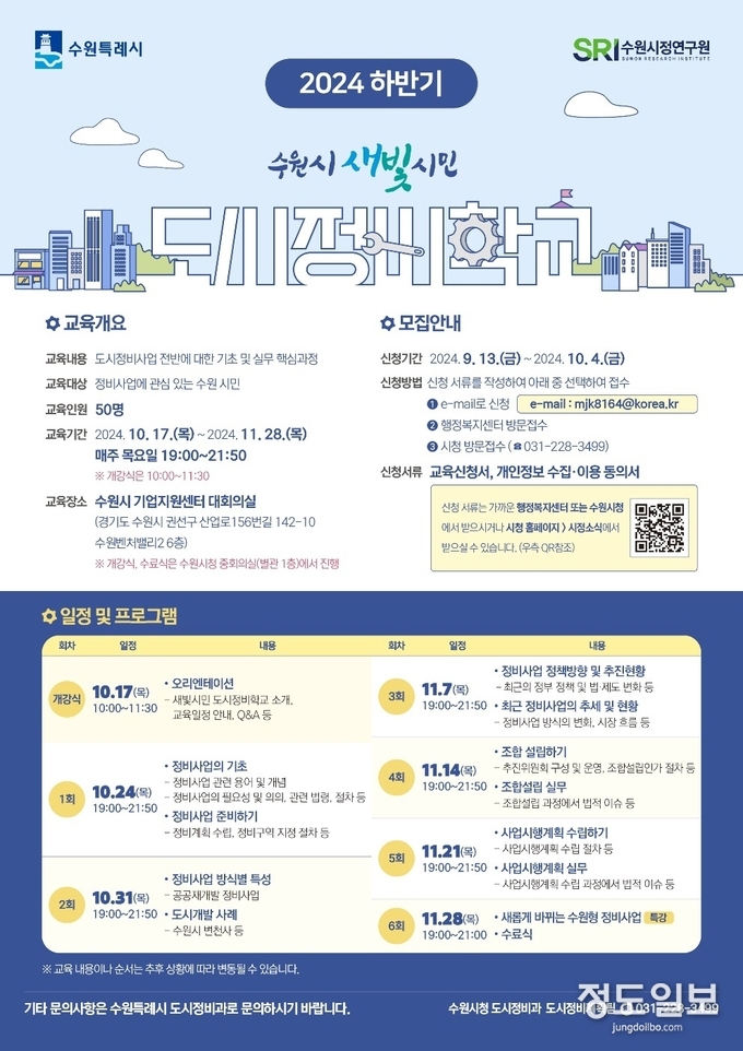 [정도일보 고정희 기자] 수원시(시장 이재준)가 도시정비사업 시민 전문가를 양성하는 ‘새빛시민 도시정비학교’ 제2기 교육생을 10월 4일까지 모집한다.