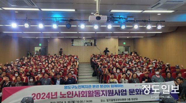 (정도일보) 영도구와 영도구노인복지관은 2024년 9월 30일, 함지골청소년수련관 대강당에서 ‘2024년 노인일자리 및 사회활동 참여자 문화활동’ 행사를 성공적으로 개최했다. 이날 행사에는 약 400명의 어르신들이 오전과 오후 두 차례에 걸쳐 참석했으며, 다채로운 공연과 함께 즐거운 시간이 마련됐다.