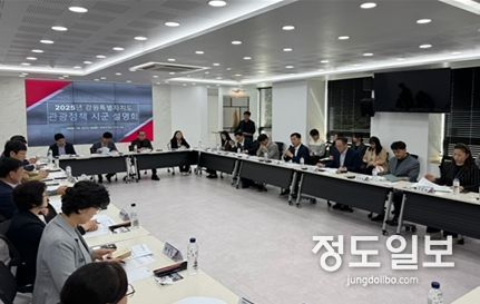(정도일보) 강원특별자치도는 10. 2. 10시, 강원도립대학교 세미나실에서 김상영 관광국장 주재로 도와 18개 시군 관광과장, 강원관광재단 관계자 등 60여 명이 참석한 가운데 ‘2025년 강원 관광정책 시군 설명회’를 개최했다.
