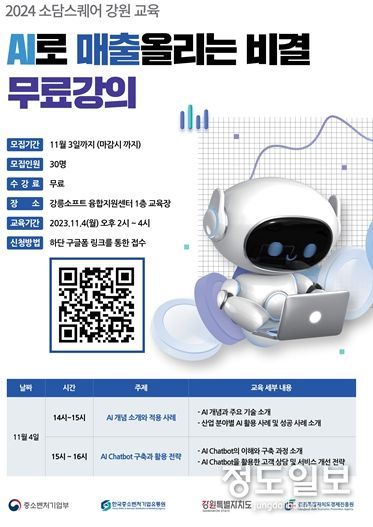 (정도일보) 강원특별자치도는 11월 4일 월요일 오후 2시에 강릉 ‘강원1인미디어센터(강릉소프트웨어융합지원센터, 강릉 포남동 소재)’ 교육장에서 도 소상공인 맞춤 교육을 실시한다.