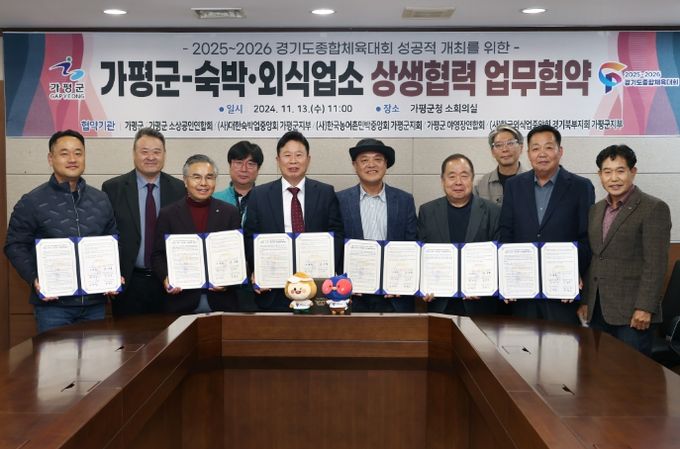 (정도일보) 가평군은 13일 2025~2026년 경기도종합체육대회의 성공적인 개최를 위해 지역 숙박·외식업 유관단체와 상생협력 협약을 체결했다.