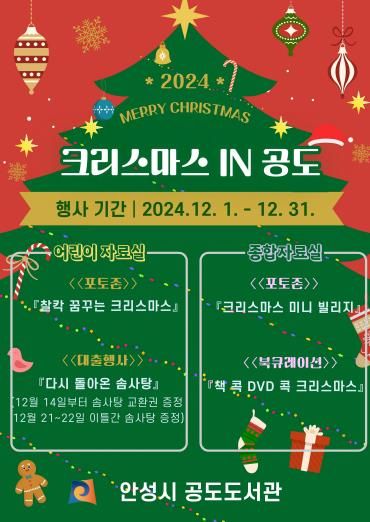이번 행사는 공도도서관과 함께 즐겁고 따뜻한 크리스마스를 보낼 수 있도록 '크리스마스 IN 공도'라는 주제로 12월 한 달간 도서 전시와 대출 행사를 진행한다.