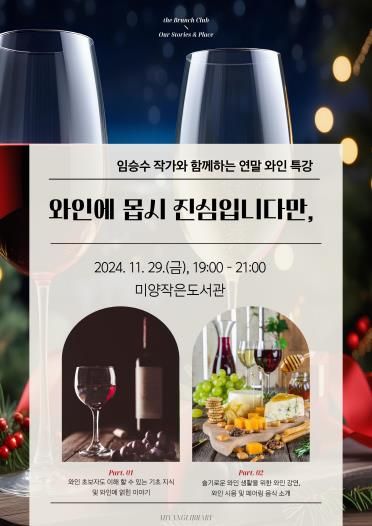 (정도일보) 안성시 미양작은도서관은 오는 11월 29일 금요일 오후 7시, 임승수 작가와 함께하는 연말 와인 특강 '와인에 몹시 진심입니다만,'을 진행한다.