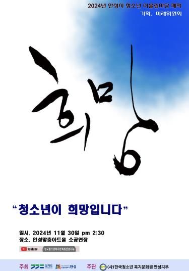 (정도일보) ‘희망’을 부제로 청소년들의 다양한 끼와 재능을 발휘하게 될 2024 안성시청소년어울림마당 폐막식이 오는 11월 30일(토) 오후 2시 30분 안성맞춤아트홀 소공연장에서 펼쳐진다.