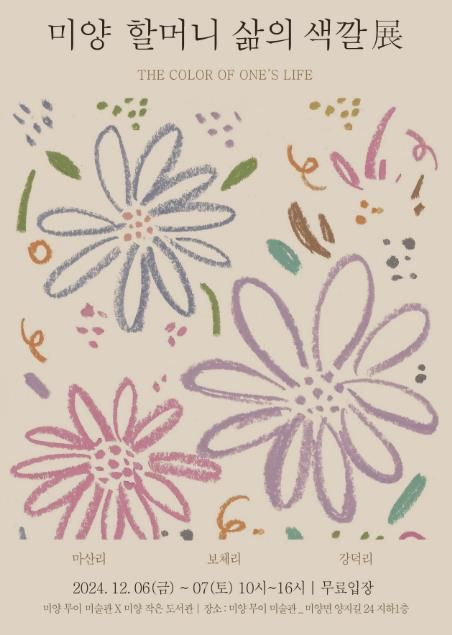 (정도일보) 안성시 미양작은도서관은 무이미술관에서 2024년 12월 6일부터 7일까지 마을 어르신들의 작품 전시회 ‘미양 할머니 삶의 색깔 展’을 개최한다.
