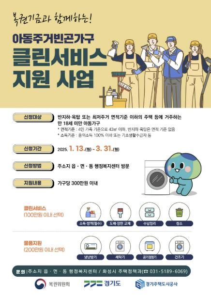 (정도일보) 화성특례시가 오는 3월 31일까지 열악한 주거 환경에 거주하는 아동의 주거환경 및 위생 개선을 위한 ‘아동주거빈곤가구 클린서비스 지원 사업’ 대상자를 모집한다.