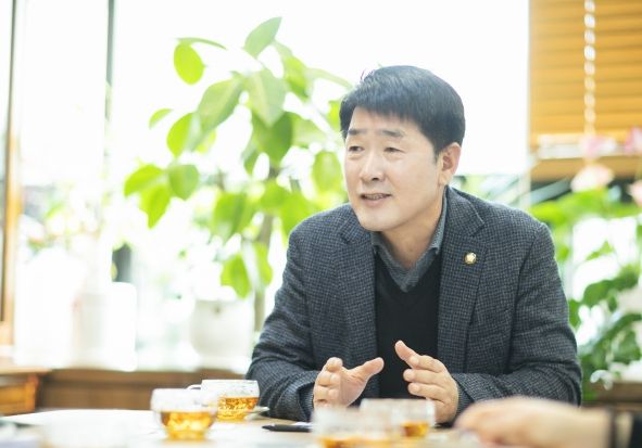 배정수 의장이 관내 지역업체 구매 활성화 간담회에서 대담 중이다