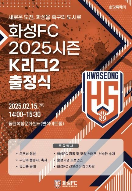 [정도일보 김현섭 기자] 화성FC가 오는 15일 동탄복합문화센터 반석아트홀에서 2025시즌 K리그2 프로 진출을 기념하는 출정식을 개최한다.