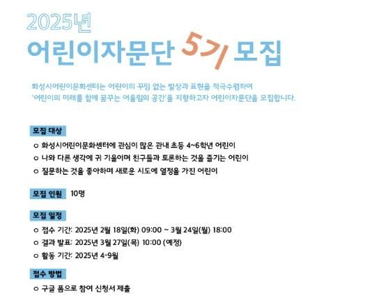 (정도일보) 화성특례시가 어린이들의 참신한 아이디어를 문화센터 운영에 반영하기 위해 화성시어린이문화센터 ‘어린이자문단 5기'를 2월 18일부터 3월 24일까지 모집한다고 18일 밝혔다.