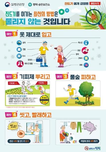 평택보건소 관계자는 “야외 활동 증가로 진드기 노출 기회가 많아지는 시기가 시작됨에 따라 진드기 매개 감염병 발생 예방을 위해 예방수칙을 준수해 줄 것”을 당부했다.