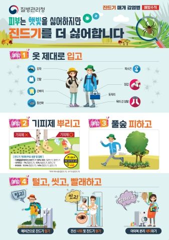 국내에서 발생하는 주요 진드기 매개 감염병은 ‘쯔쯔가무시증’과 ‘중증열성혈소판감소증후군(SFTS)’이며, 봄과 가을철 텃밭, 농지, 산에 서식하는 균 또는 바이러스를 보유한 진드기에 물려 감염되기 때문에 농작업 및 텃밭작업 전, 또는 작업 시 ▲진드기에 물리지 않도록 예방수칙을 준수하는 것이 중요하며, 진드기에 물렸거나 2주 이내 발열 등 ▲증상이 나타나면 즉시 의료기관을 방문해 진료받아야 하며, 특히, 진료 시 ▲의료진에게 농작업 등의 활동 이력을 알리도록 교육했다.