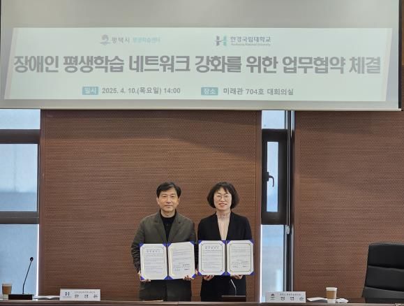 이번 협약은 한경국립대학교 평택캠퍼스 미래관에서 진행됐으며, 양 기관은 장애인의 사회참여 기회를 확대하고 장애인 평생교육 활성화를 위해 상호 협력하기로 했다.