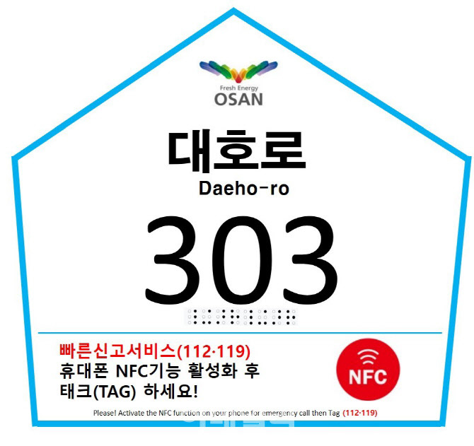30일 경기 오산시에 따르면 스마트 건물번호판은 무선 와이파이나 앱 설치 없이도 NFC 기능이 탑재된 스마트폰을 터치하는 것만으로, 현재 위치 정보가 경찰서와 소방서에 즉시 전달된다. 특히 고휘도 반사소재를 적용한 흰색 배경과 점자판을 더해 시인성과 접근성을 함께 높였다.