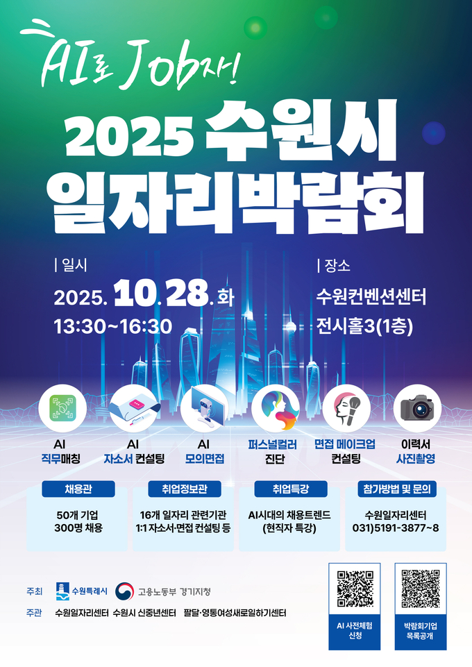 [정도일보 고정희 기자] 수원특례시(시장 이재준)와 고용노동부 경기지청은 10월 28일 오후 1시 30분부터 4시 30분까지 수원컨벤션센터 전시홀에서 ‘AI로 JOB자-2025 수원시 일자리박람회’를 개최한다.