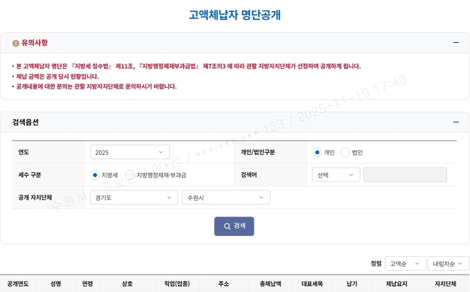 고액·상습체납자 명단은 수원시 홈페이지>분야별정보>세금>정보마당>‘고액 상습체납자 공개’ 게시판에서 확인할 수 있다.