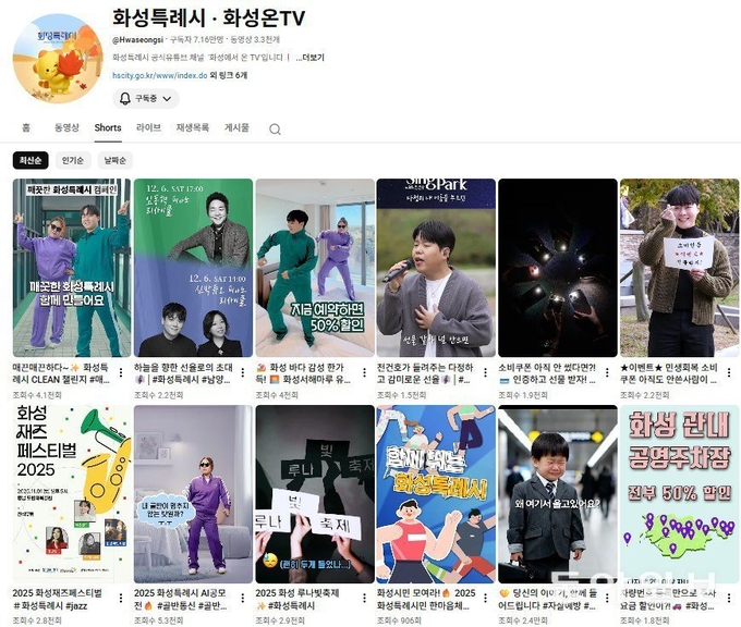 누적 게시물은 1만2434건으로 지난 10월 기준, 화성특례시 공식 유튜브 ‘화성특례시·화성온TV’는 구독자 7만 명을 넘어 전국 226개 기초지자체 중 2위에 올랐다. 조회 수도 1231만 회를 돌파해 구독 규모와 콘텐츠 소비력 모두에서 양적·질적 성장을 동시에 달성했다.