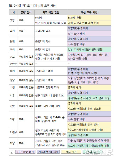 경기연구원이 경기도 과밀억제권역 14개 시를 대상으로 실시한 면담 조사 결과, 7개 시(과천시, 광명시, 의왕시, 하남시, 고양시, 구리시, 의정부시)가 공업지역 물량 부족을 제기했다.